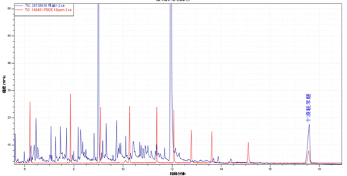 按照IEC62321 、GB/Z 21276-2007 等体例。切确称借鉴美妙被破坏后的检样2g,索式浸提6小的时候之上,移动并兑水近干,矽胶柱被污染的,逆转挥发兑水近干,用甲苯定容至5mL,过滤清洁,上机试验。试验所得的相干谱图下例: