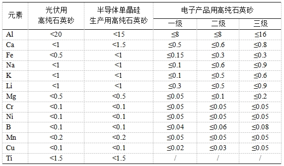 石英砂中杂质元素限值(单元:μg/g)
