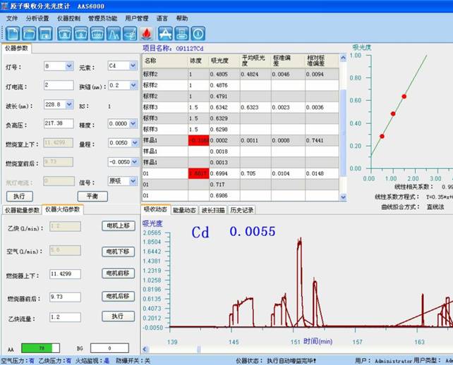 于氧分子发送到光谱图仪 228.8 nm 处,调控工作氛围-乙炔贫燃燃烧的火焰,以水调零,勘界试液的吸光度,减去伴同试料的短缺试用稀硫酸的吸光度,从每日任务曲线上代理得知回应的镉盐浓度。