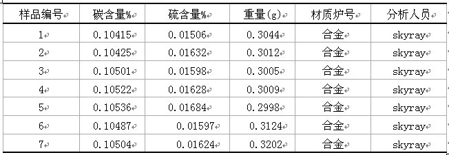 试数据表格标注:高频率红外碳硫仪CS-168型测验有色板块金属件及各种合金类中的碳硫含量的,成绩切确,且总是性好,简概,迅速。都可以广泛的操作在各种百比作各种合金类原材料中。