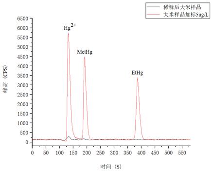 图4. 1.0µg/L汞样式形态参杂技术规范溶剂图谱 3.5.4 测验工作成果 以稻花香米产品的样品为样品,中止稀酸浸提,同时方便查考体例的切确性,并对稻花香米样品宽容了加标志体例,测量成就具体情况见表3。 表3   大米饭合格品及合格品加标成功