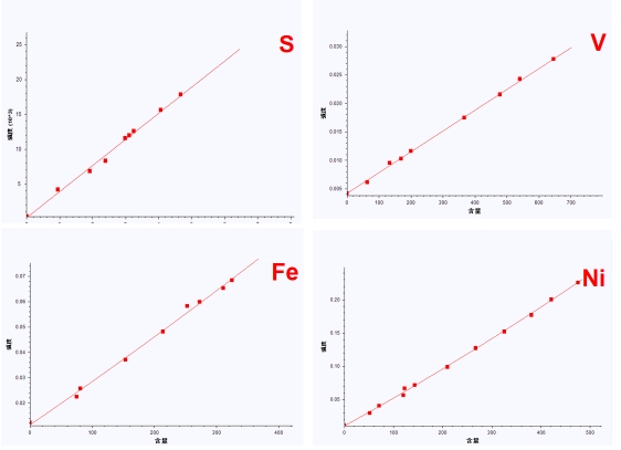 图2:S、V、Fe、Ni元素含量与强度线性干系图