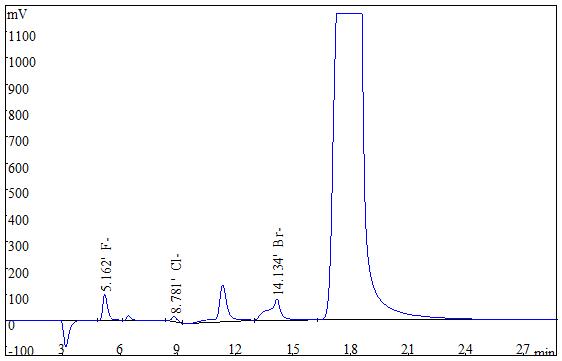 切确称取0.2g(切确至0.0001g)试样,接纳氧弹熄灭后冷却定容,经0.22μm的水系滤膜过滤后上机获得测试谱图以下图2、图3所示。