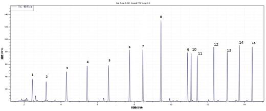 1.正己烷 2.苯 3.三氯乙烯 4.甲苯 5.辛烯 6.乙酸丁酯 7.乙苯 8.对(间)二甲苯 9.邻二甲苯 10.苯乙烯 11.壬烷 12.异辛醇 13.十一烷 14.十四烷 15.十六烷