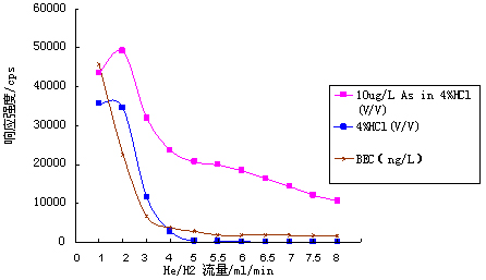 仪器起首在规范形式下停止参数优化(操纵10μg·L-1的Li、Co、In、U、Ce调谐液对仪器任务参数停止调理,使仪器活络🌳度高,同时氧化物及双电荷产率小于3%);🤡再开启He/H2碰撞反映气,慢慢增大He/H2流量,测试超纯水、4%HCl及10μg·L-1 As(4%HCl介质)在75amu处的呼应旌旗灯号,计较其背景等效浓度(具体数据见表1及图1);并操纵As标液进一步优化He/H2流量,获得仪器任务参数如表2所示。