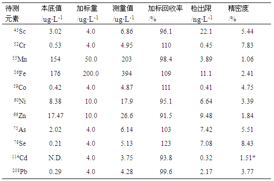 取昆山某地表水,参考国度环保检测规范HJ700-2014样品处置,用0.45μm滤膜将水样过滤,插手 HNO3酸化处置,使其pH小于2。同时配制插手各元素标液的加标样品,具体加标量为:Sc Cr As Se Cd Pb为4μg·L-1,Mn 50μg·L-1,Fe 200μg·L-1,Ni Zn 10μg·L-1。