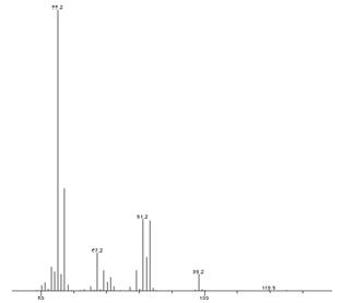 甜美素(su)的(de)首要(yao)衍生物环己醇亚硝酸酯(zhi)作为(wei)定(ding)(ding)(ding)性(xing)和定(ding)(ding)(ding)量(liang),如图(tu)1。保(bao)留时(shi)候8.51ꩲ1min.定(ding)(ding)(ding)性(xing)离(li)子(m/z)为(wei)55,81,83。定(ding)(ding)(ding)量(li🅰ang)离(li)子为(wei)55。质谱图(tu)见图(tu)2.