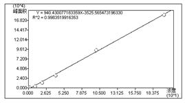 精确吸收浓度为10ug/mL的甜美素规范溶液10ul于50ml离心管中对应衍生物浓度别离为2ug/mL、10ug/mL、20ug/mL、100ug/mL、200ug/mL,根据上述标样衍生化步骤停止衍生化,停止线性测试。尝试所得线性方程为:y=940.43x-3525.57,线性相干系数为0.9984,如图5所示。